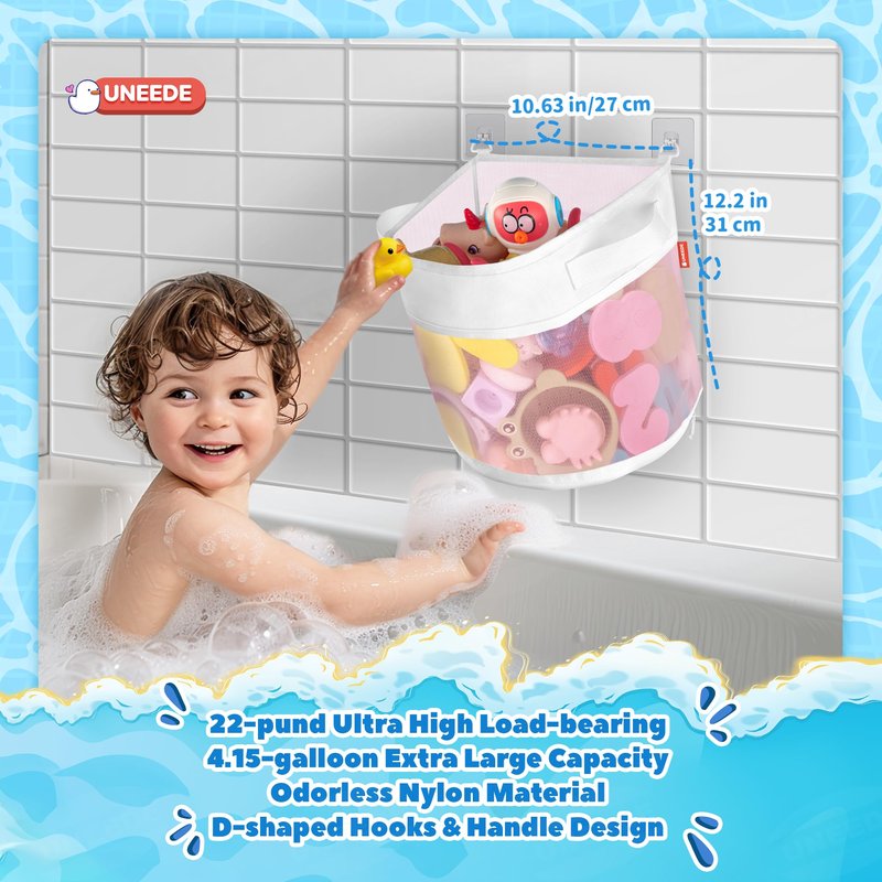- 【UNEEDE Bath Toy Storage Design】Here you would see is our UNEEDE most successful 4.15 gallon large bathroom toy storage.We made it We made it can not only hang on the wall, but also stand on its own on the floor,which means you could carry it outside with your toys.