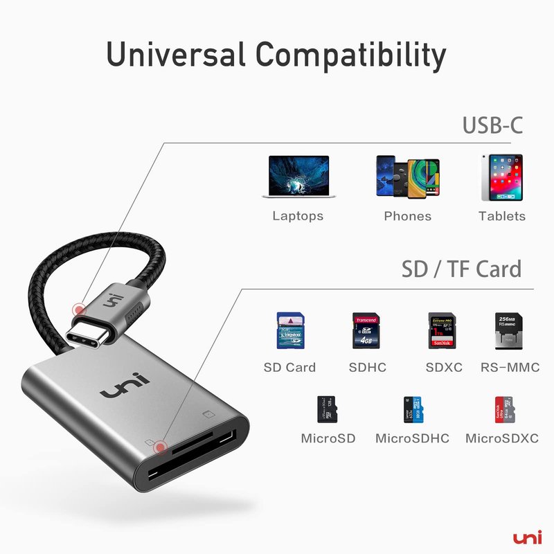 - 【Ultra High-Speed Transfer】Say Hi to uni USB-C SD/MicroSD Card Reader. This Type-C port supports USB 3.0 that can transfer stably data transfer speeds up to 5Gbps and is backward compatible with USB 2.0/1.1. Transfer photos/videos in just seconds. It'll get your transfers moving along at a healthy clip. Note: THE ACTUAL SPEED depends on your devices.