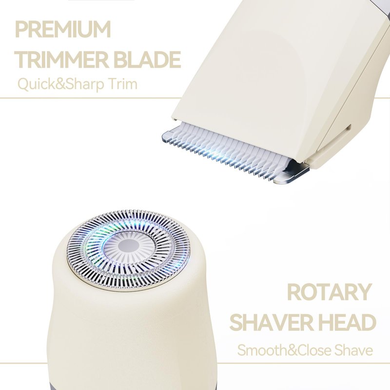 - 【3-IN-1 Women Trimmer For Whole body Hair Removal】This electric women body groomer set is coming with three different detachable blade heads,including wide trimmer head for large area such as legs,arms,armptis hair removal. Small trimmer for narrow area such as pubic hair in bikini area.Round rotary razor head for quick facial hair shave,such as fluff and hair from lips, chin, and cheeks.
