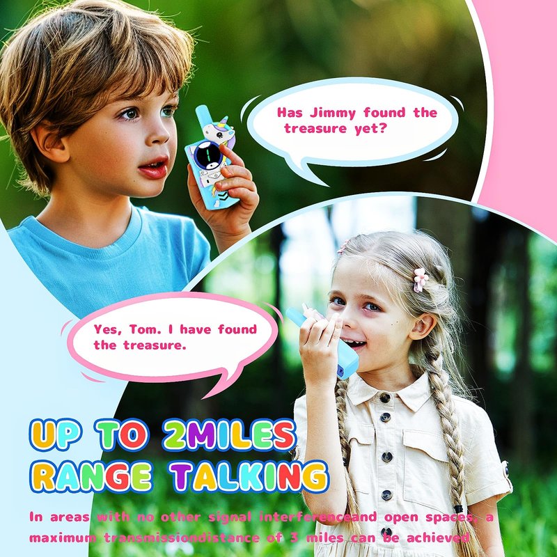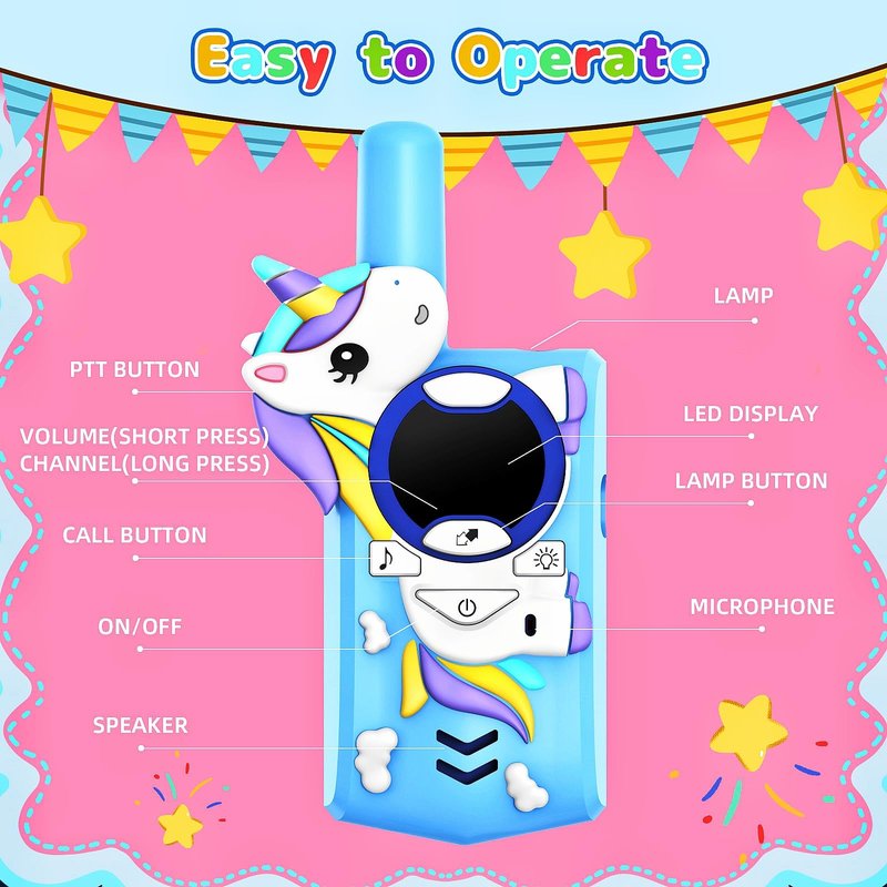 - [Children-friendly Design] These cartoon walkie-talkies are designed with ergonomic lightweight features, making it comfortable for children to hold in their hands. The communication buttons on the left side are conveniently placed for easy operation. With a weight of only 79 grams, your child can easily carry these walkie-talkies.