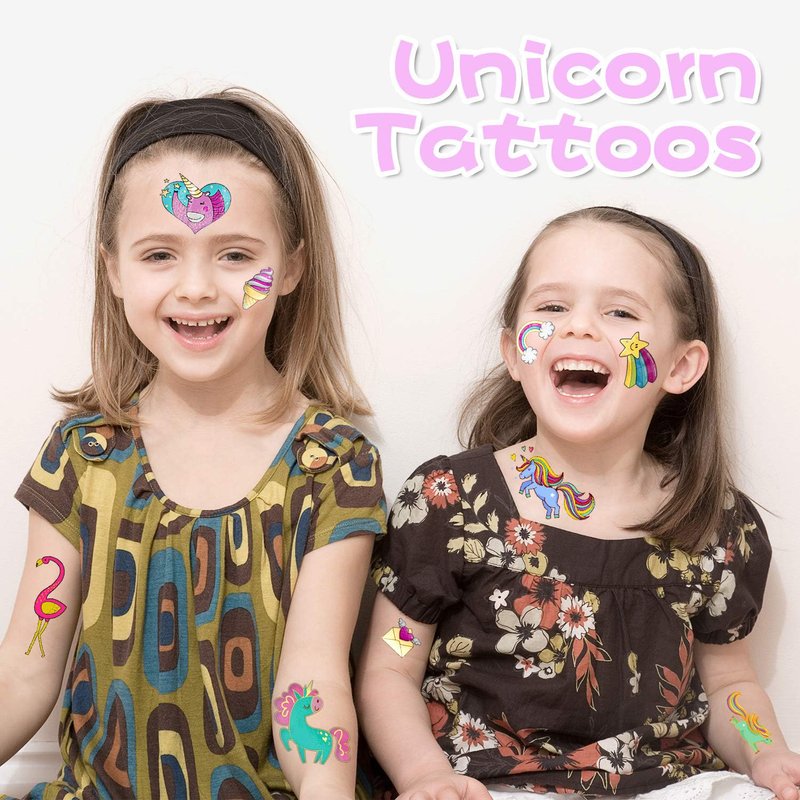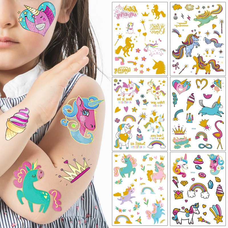 - Unicorn themed creative tattoo. Package contain 58+ large unicorn flash tattoos temporary tattoos for kids. Add a touch of colorful to your arms, shoulders, legs, and other body parts with realistic full-color (pink+green+blue+ gold metallic glitter color ) ,a series of funny style to provide big fun for both children and adults alike!