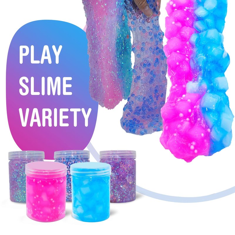 - This slime kit contains many props packs. Various accessories: candy chips, glitter tubes, fish peas, foam balls and sponge cubes. 5 cans of slime: 1 can of pink, purple and blue mixed cotton slime, 4 cans of transparent slime glue, transparent slime can be mixed with foam crunchy slime,glimmer tubes slime,fish beans slime and butter slime