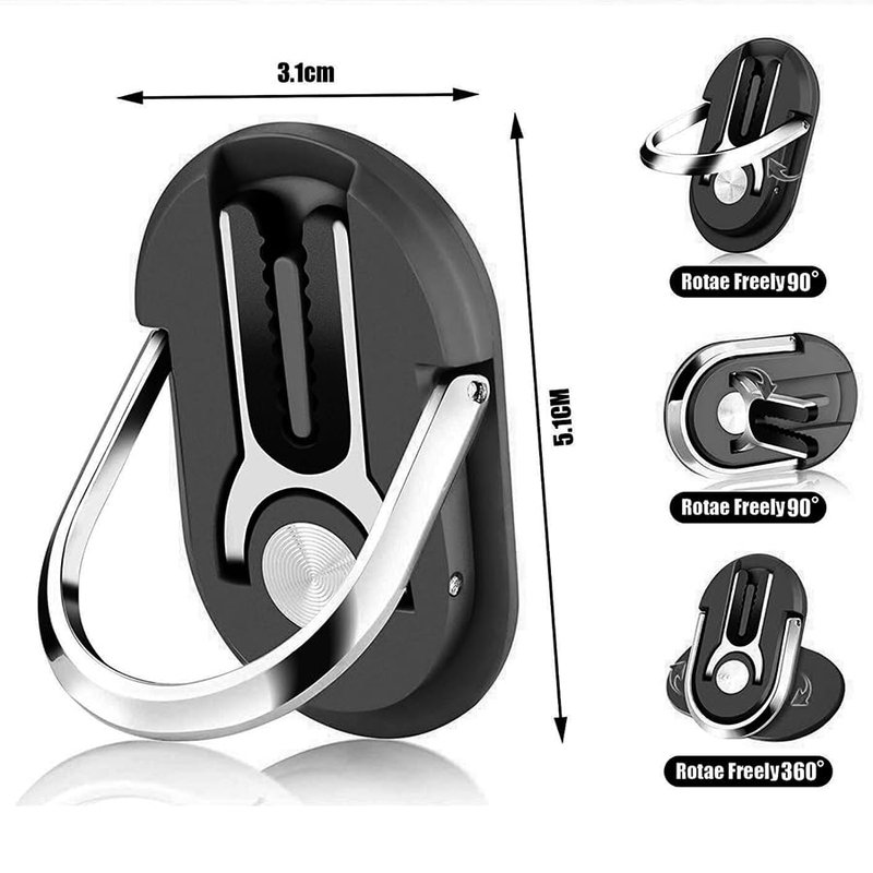 **MULTIFUNCTIONAL STANDARD PHONE HOLDER** Multipurpose use: This phone holder offers versatile functionality as a 360 Rotating Finger Ring Holder, Phone Stand, and Car Air Vent Mount. Available in two stylish colors: Silver and Black. Finger Ring Holder: Keep your phone secure and your fingers comfortable with these multipurpose bracket holders. They provide a secure grip to prevent drops and relieve finger strain during extended use, whether you're capturing scenic photos or watching videos. Phone Stand: Designed with 360 rotation and 90 flip folding, this holder allows your phone to rotate freely between horizontal and vertical orientations. Set it on your desk, bed, or any surface for hands-free viewing, letting you relax or multitask while enjoying your device. Car Air Vent Mount: Transform the holder into a convenient car mount for navigation purposes. Simply clip it onto your car's air vent using the silicone serrated clips, providing a secure hold without damaging the vent. Compatible with most car air vents, it ensures safe and accessible phone use while driving. High-Quality Adhesive: The holder features a strong adhesive that leaves no residue when removed. For easy removal, it's recommended to attach it to a phone case rather than directly to the phone. Ensure a secure attachment by following the simple installation steps, allowing it to set for 24 hours before use.
