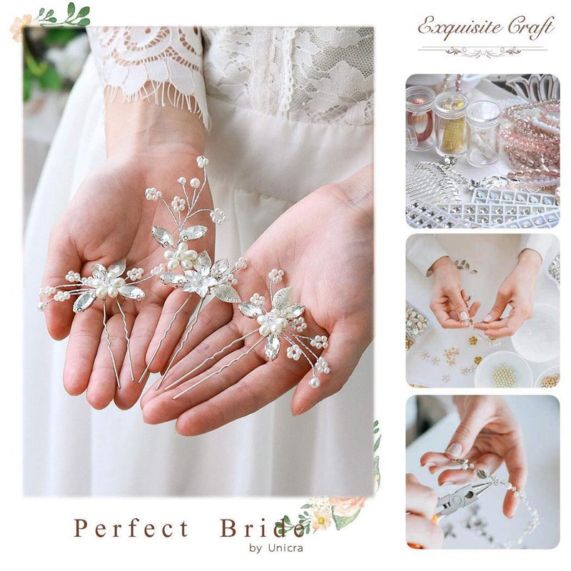 Unicra Bride Wedding Flower Hair Pins Bridal Pearl Hair Piece Crystal Hair Accessories for Women and Girls (Pack of 3) (A-Silver)