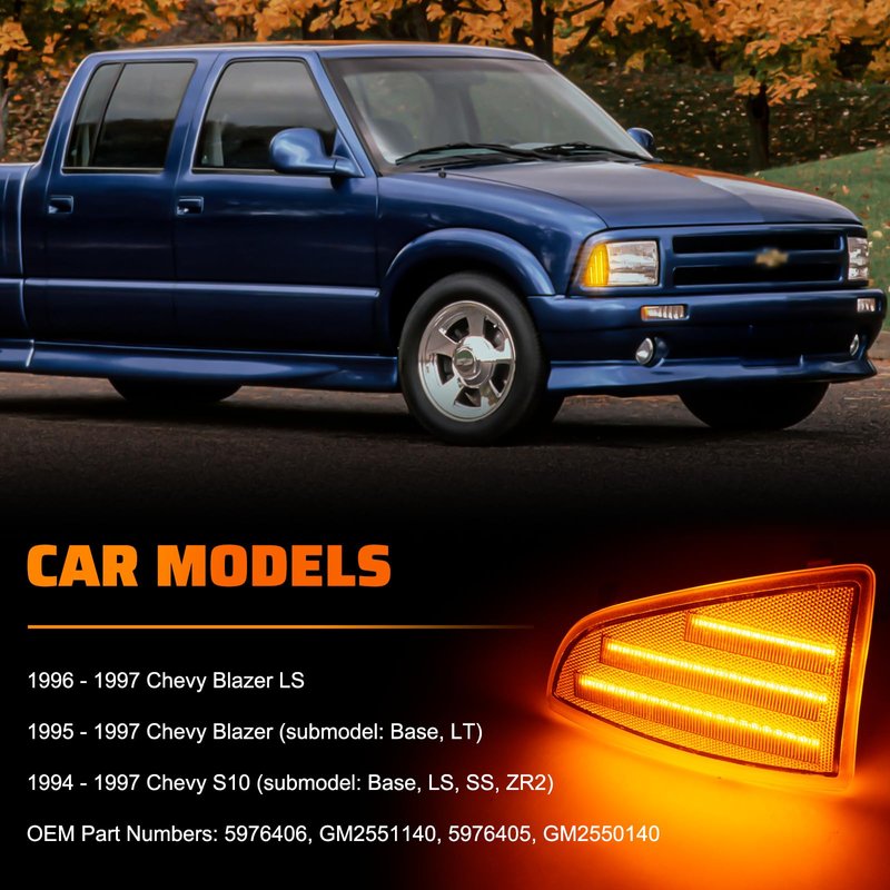 - 【Compatibility 】LED Front Corner Light compatible with 1996 - 1997 Blazer LS,1995 - 1997 Blazer (submodel: Base, LT),1994 - 1997 S10 (submodel: Base, LS, SS, ZR2). OEM Part Numbers: 5976406, GM2551140, 5976405, GM2550140. LED Amber Front Side Signal Lamps Clear Lens OEM Signal Light.