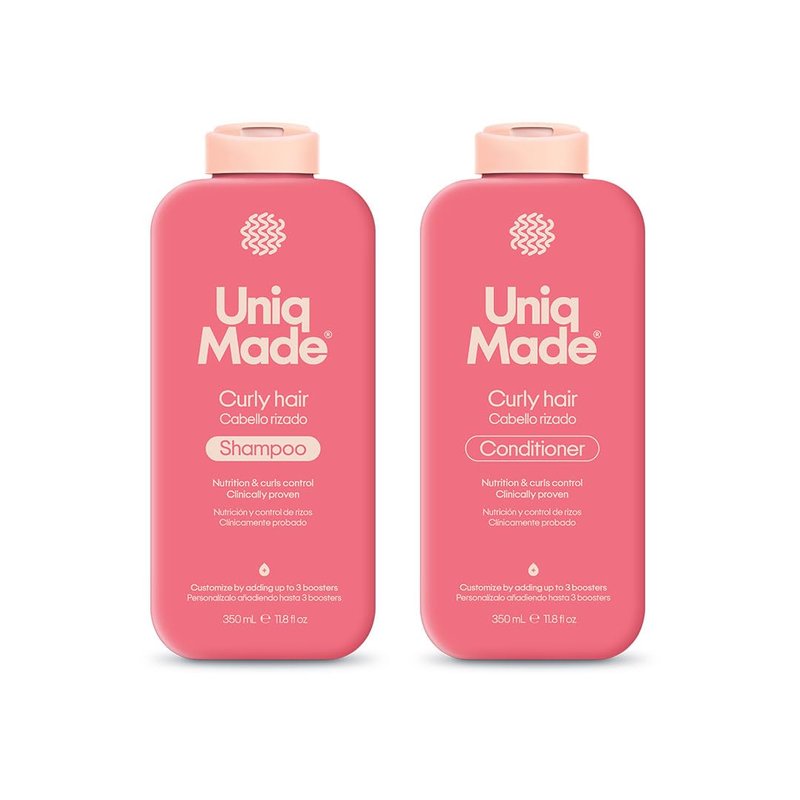 Personalize with for care as Unique as you Discover the secret to perfect curls with the Uniq Made Curly Hair Care Kit! This exclusive kit includes a Shampoo 11.8 fl oz, Conditioner 11.8 fl oz & Mask 8.4 oz. specially formulated to nourish and define your curly hair. Designed to highlight the natural beauty of your curls, each product works in synergy to give you exceptional results from the first application. Personalize your Care Experience Take your hair care routine to the next level with the option to add up to 3 custom Boosters. Choose the ones that best suit your needs! - Oil Control Booster: Keep your scalp fresh and balanced, reducing excess oil and prolonging the feeling of cleanliness. - Color Protection Booster: Protects and prolongs the intensity of your color, keeping it vibrant and radiant for longer. - Hydration Booster: Provides extra hydration for softer, more flexible and frizz-free curls. Anti-Dandruff Booster: Fights dandruff and relieves scalp irritation, leaving it clean and healthy. - Anti-Frizz Booster: Controls frizz and improves the manageability of your curls, keeping them defined and frizz-free throughout the day. - Repair Booster: A highly concentrated formula with vegetable protein. Adds a boost of deep nourishment to the hair to repair damaged strands, strengthening the hair and protecting it from breakage How does it work? * Select your Kit: Includes Shampoo, Conditioner and Mask for Curly Hair. * Customize your Kit: Add up to 3 Boosters to the Shampoo according to your specific needs. * Enjoy Your Perfect Curls: Experience a hair care routine tailored for you.