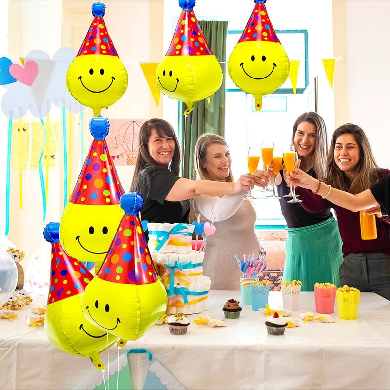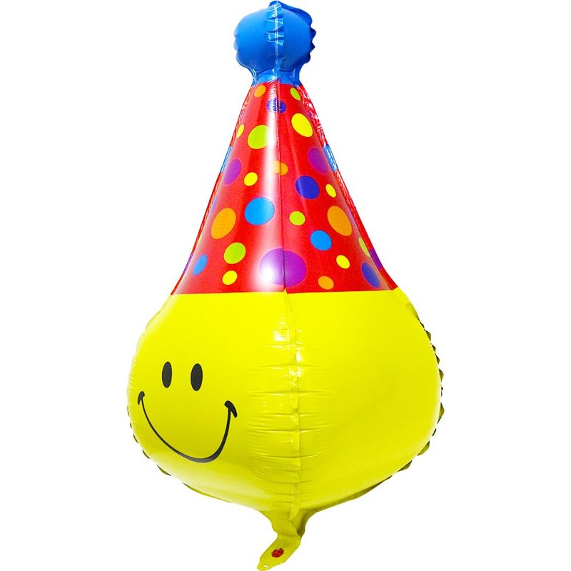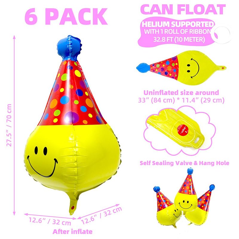 6 * emoticon party hat balloons smile face hat mylar foil balloons, uninflated size is around 33'' (84 cm) tall * 11.4'' (29 cm) width (it gets smaller and around 28'' when inflated, see picture for size).