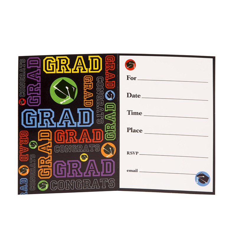 - VIBRANT DESIGN: provide guests with all of the important event details with these invitations that feature vibrant and assorted colors "Grad" and "You're Invited" headlines.