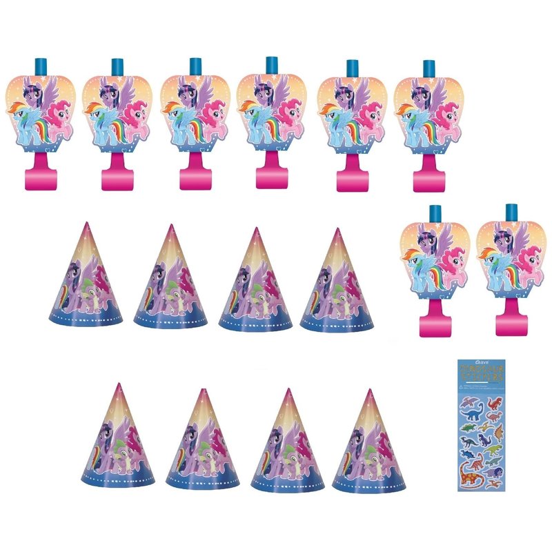 Unique My Little Pony Birthday Party Supplies Favor Bundle Pack Includes 8 Party Paper Hats, 8 Party Paper Blowouts and 1 Dinosaur Sticker Sheet
