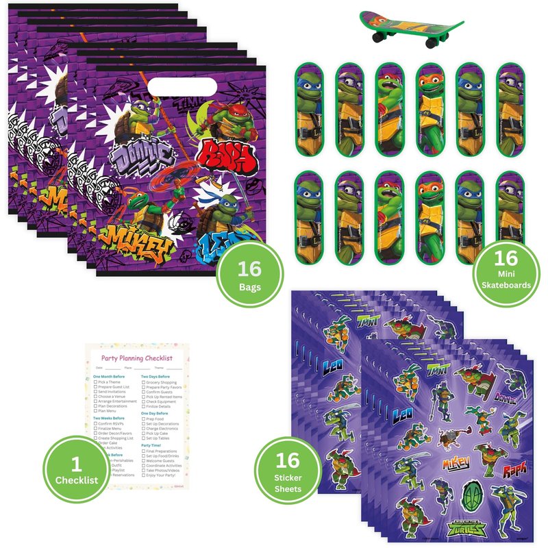 - Ninja Turtles Party Favors for 16 Guests - 16 plastic Ninja Turtle party bags, 16 sticker sheets, 16 mini skateboards. Additionally, includes 1 party planning checklist to keep your preparations on track