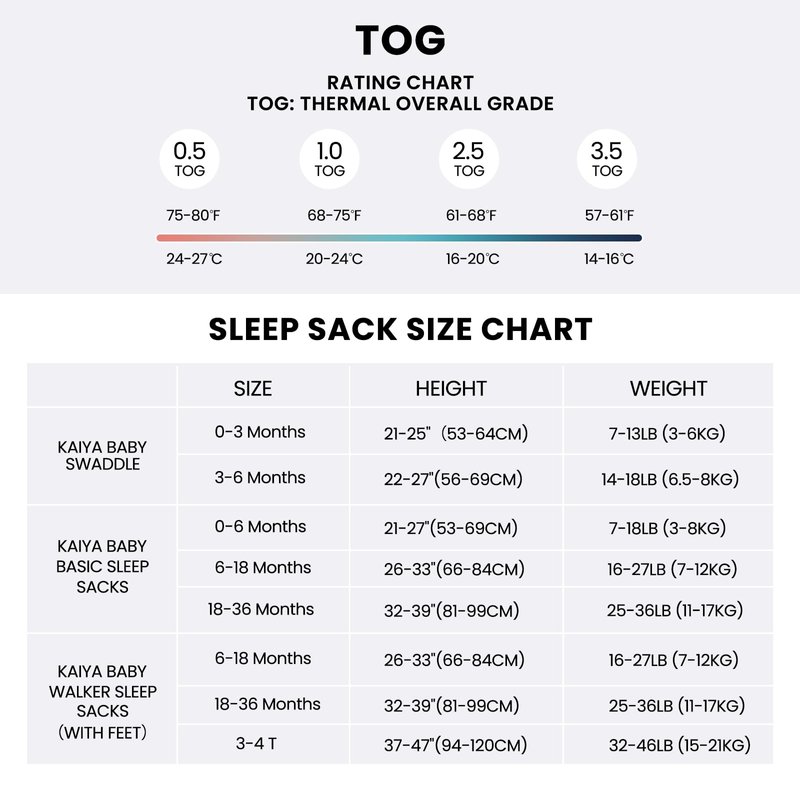 kaiya baby brand is dedicated to the health and safety of infant sleeping bags. We specialize in the following product categories: baby sleep sack toddler sleep sack newborn sleep sack baby wearable blanket infant sleep sack. Our styles include: one-piece with sleeves, one-piece without sleeves, two-piece with sleeves, two-piece without sleeves, and swaddle designs. Our colors include: solid colors (black, white, pink, yellow, green, blue, purple, gray, silver, off-white, red, gold), stripes, shells, constellations, and clouds. We offer 3 sizes for you to choose from: S (0-6 months), M (6-18 months), L (18-36 months)(3T-4T)(2T-3T). There are 4 thickness options available(Fahrenheit degree): 0.5 TOG (75-80 ), 1 TOG (68-75 ), 2.5 TOG (61-68), 3.5 TOG (57-61).