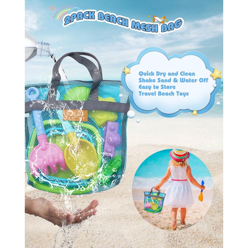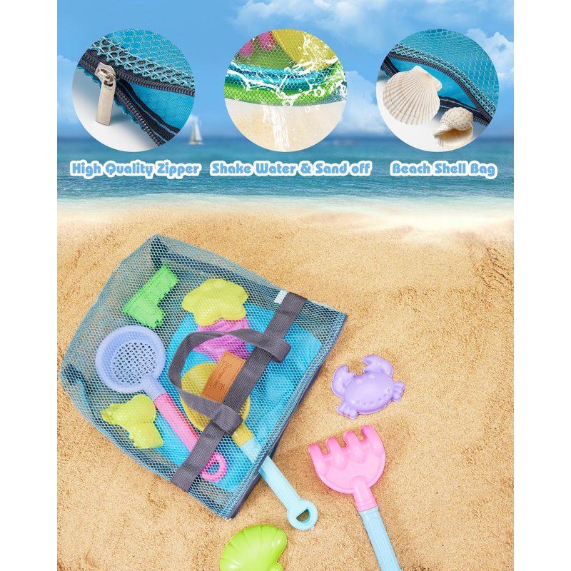 - Easy Carry Mesh Beach Bag with Zippers: The mesh design will make it dry quickly, lightweight, washable, reusable, easy to clean and fold. Sand and water can easily leak through the mesh, keeping the things clean and dry. The sturdy zipper closure keeps the toys securely in place. Crafted with durable stitching, these bags are built to endure regular use. The mesh bag for sand toys make it convenient to store or carry your beach sand toys for kid's beach travel and outdoor activities.