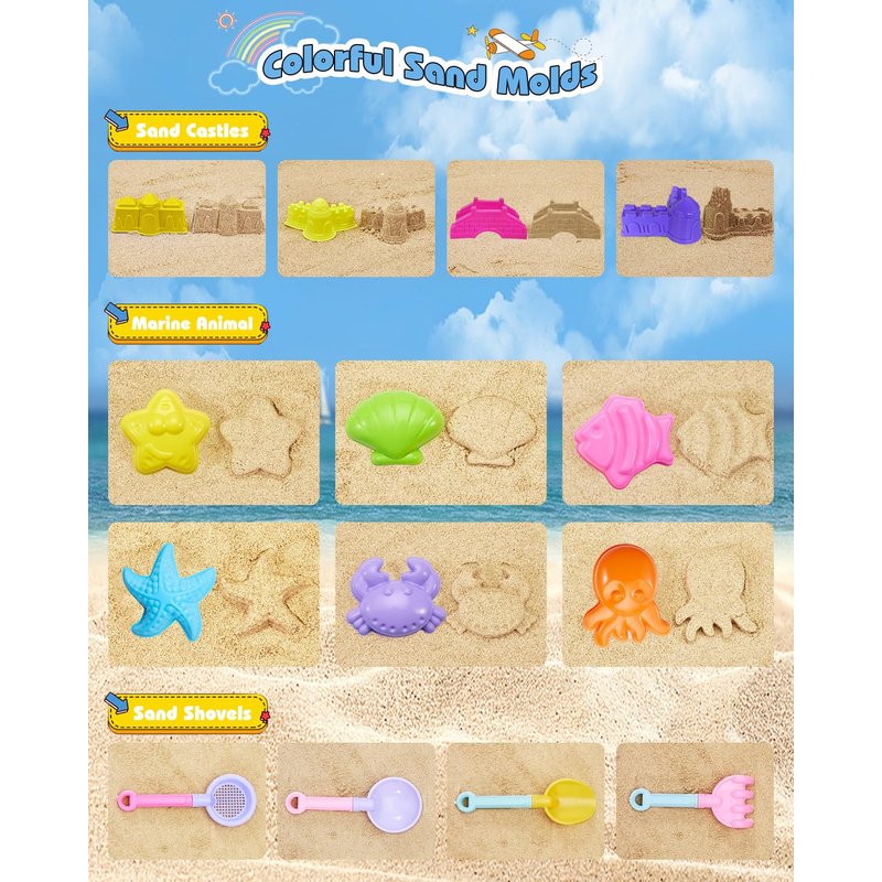 - Various Fun Animal Sand Molds & Tools: This kids beach toys set includes creative sand molds to make sand castles, dinosaurs, sea animals. All the sand molds and tools are made in birght colors and cute shapes. Mult-colorful collapsible sand castle toys for beach sets encourage kids to create different castles, and cultivate kids hands-on ability and imagination.