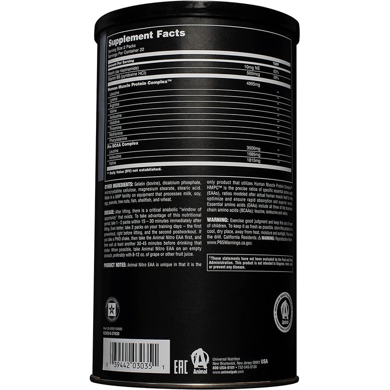 Accelerated Amino Transport - 100% Uncoupled Aminos - Human Muscle Protein ComplexAnimal Nitro Accelerated Amino Transport.Aminos are the basic building blocks of muscle. Aminos can also trigger of muscle growth.As a lifter, you need them, especially the right ones. While there are nearly two dozen different amino acids, only a select few are absolutely essential for igniting the muscle drive, as new research has shown. Not surprisingly, these required aminos are the same ones found in human muscle protein. Animal Nitro is the first and only supplement that contains the correct ratios of those aminos based on human muscle protein itself. This complex of aminos is appropriately called Human Muscle Protein Complex (HM PC&trade) and they're only in Animal Nitro. HM PC consists of special "uncoupled" aminos exclusively - those that are free of the chemical bonds that can limit maximum utilization. By using only 100% uncoupled aminos in HM PC, Animal Nitro delivers a precisely controlled dose of aminos that are "targeted" to efficiently enter systemic circulation through a novel amino transport system. Here's how it works. Each pack consists of a measured 6,000 mg dose of uncoupled aminos (HM PC). Once ingested, they form a special bolus (a protective "mass) that allows them to efficiently bypass the liver. Now this is vital as the liver captures and metabolizes regular amino acids (like those found in protein powders such as whey and more conventional amino supplements) to urea, a waste product. Once safely past the liver, this bolus of uncoupled aminos enters systemic circulation, where they can exert their powerful pharmacological actions. When combined with resistance training, Animal Nitro can actually help your body deliver more nutrients to your working muscles, recover more quickly, and build new muscle mass by enhancing protein synthesis, improving net muscle protein balance, and preventing muscle breakdown.