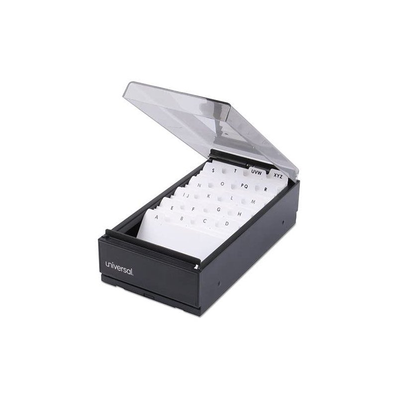 Hinged lid opens easily and front panel tilts forward for easy access. Attractive metal file with smoke-color plastic top has generous capacity to manage a multitude of contact cards. Includes 20 A-Z guides to keep contacts organized. Global Product Type: Card Holders-Covered Tray Business Card File; Card Holder Type: Covered Tray Business Card File; Card Capacity: 600; For Card Size: 2 x 3 1/2.: