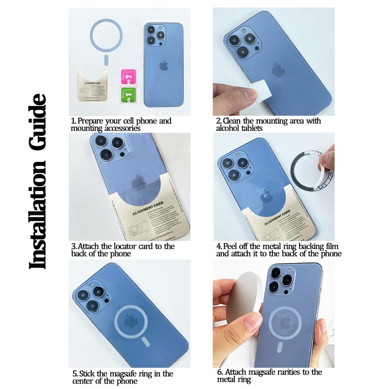 • Easy Installation: Before installation, make sure the surface is clean and dry with the supplied alcohol pads, place the metal ring on the outside of the smooth and flat phone case; place the locator card in the center of the phone case, tear off the protective film of the magsafe metal ring and fix it in the correct position, then you can easily realize wireless charging. Warm reminder: the magsafe sticker is not reusable.