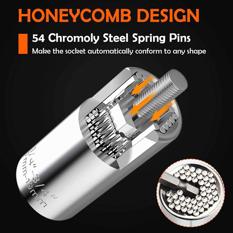 Why Choose Us? This Universal Socket fits both standard 1/4 to 3/4 inch and metric 7 to 9 mm that can grasp any shape nut, such as wing nut, hook nut, hex nuts, square nuts, crew eyes, bolt heads, and even worn and Damaged nut. This Universal Socket is small and light and can replace a whole socket set. You can keep it in your car, boat, bike, backpack, tackle box, or back pocket. Amazing Gift for Men & Women Ideal and unique gift for men, women, dad, husband, boyfriend, friends, or grandma on Christmas, Birthday, Thanksgiving, or Father's Day. Perfect gadget for home improvement, construction, carpentry, auto repair, and other household maintenance. The must-have gift for the Handyman, Do-It-Yourselfer, or Mechanic. This Universal Socket is a great stocking stuffer!