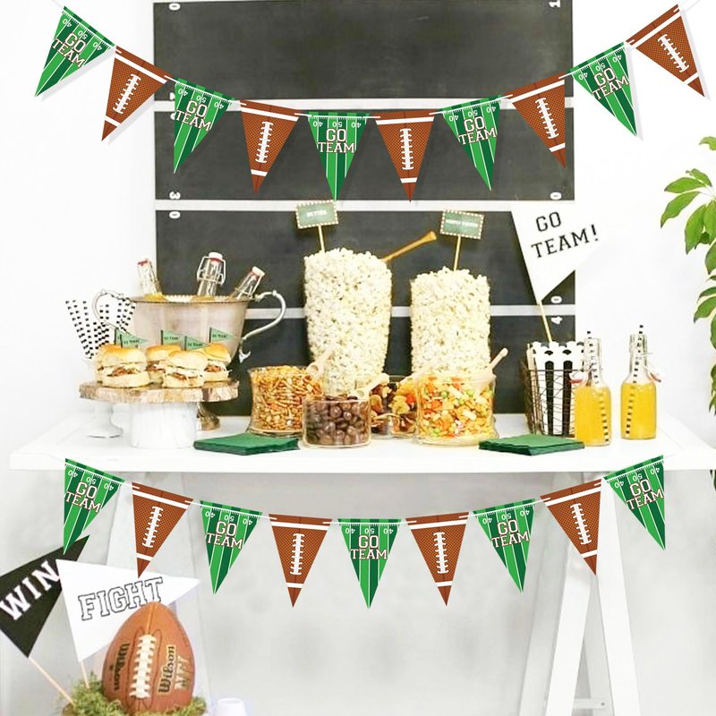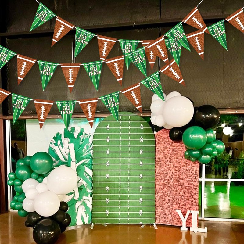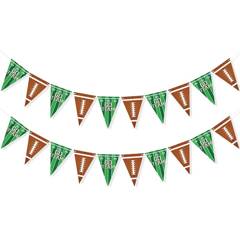- Durable & Reusable - The football banner is made of high-quality cardstock, features football field with "GO TEAM" letters and football patterns, double sided printed that can be seen from any angles, 2 strands of 9.8 feet long football garlands, each garland includes 10pcs football pennant, total 20pcs, easily folded and storage for next party use
