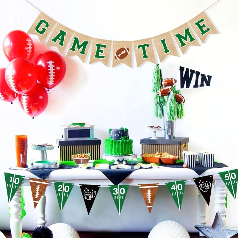 - Packing includes: The game time banner for football party decorations includes 2 banners, one is burlap banner printed with the words of "GAME TIME", another with 9pcs football theme garland, vibrant and eye-catching