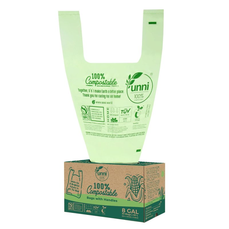 UNNI Compostable Bags with Handles, 8 Gallon, 30 Liter, 30 Count, 0.8 Mil, Kitchen Food Scrap Waste Bags, T-Shirt Bags, ASTM D6400, US BPI, CMA & OK Compost Home Certified, San Francisco