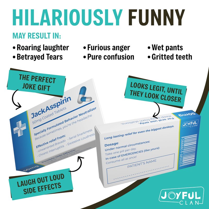 - SPECIALLY FORMULATED BEHAVIOR NEUTRALIZER - say goodbye to unwarranted bravado and chronic interruptitis with JackA**pirin's potent formula. Designed to combat even the most stubborn cases of jackassery with a hearty dose of humor, this gag gift is sure to keep the laughs flowing long after the recipient has got the message you’re ‘subtly’ trying to tell them