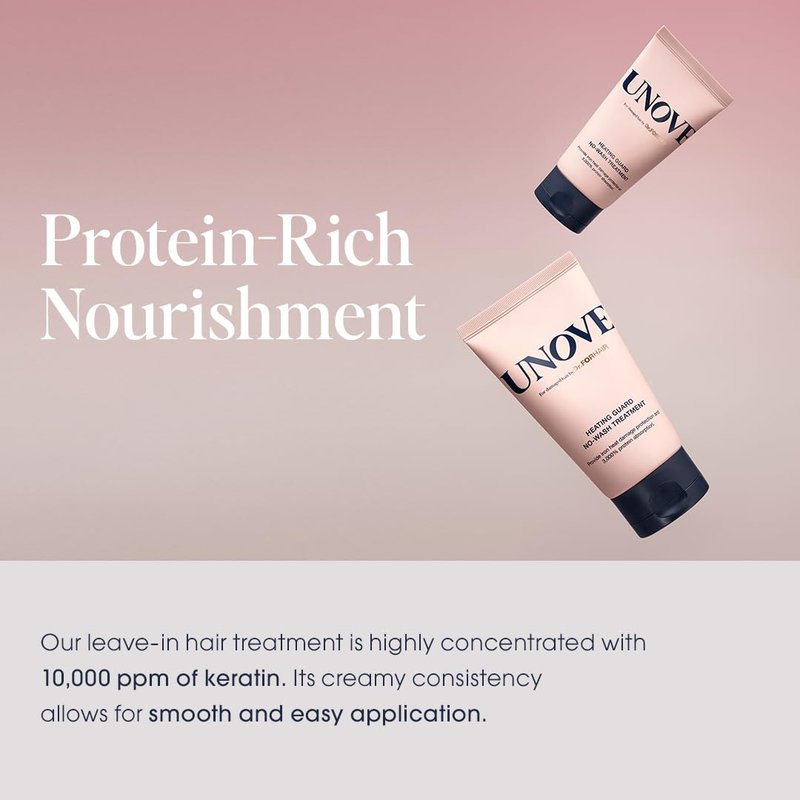 - BEST HAIR SOLUTION FOR YOU – UNOVE Heating Guard No-Wash Treatment is the solution for damaged, split, dry, rough hair prone to breakage and frizziness. Best used for as a leave-in treatment. This treatment provides iron heat damage protection up to 392°F/200°C and 3000% protein absorption. By providing your hair with the essential deep care it deserves but doesn’t always get, this treatment will effectively enhance your hair health and growth to become healthier and full of life.