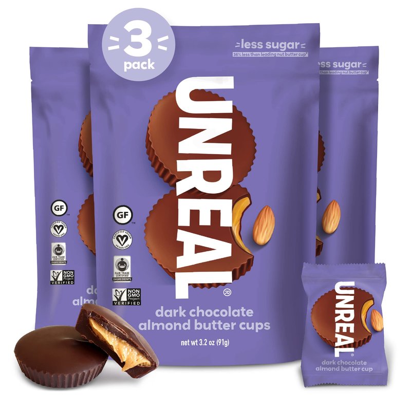 UNREAL Dark Chocolate Almond Butter Cups | 5g Sugar | Certified Vegan, Gluten Free, Fair Trade, Non-GMO | No Sugar Alcohols or Soy | 3 Bags