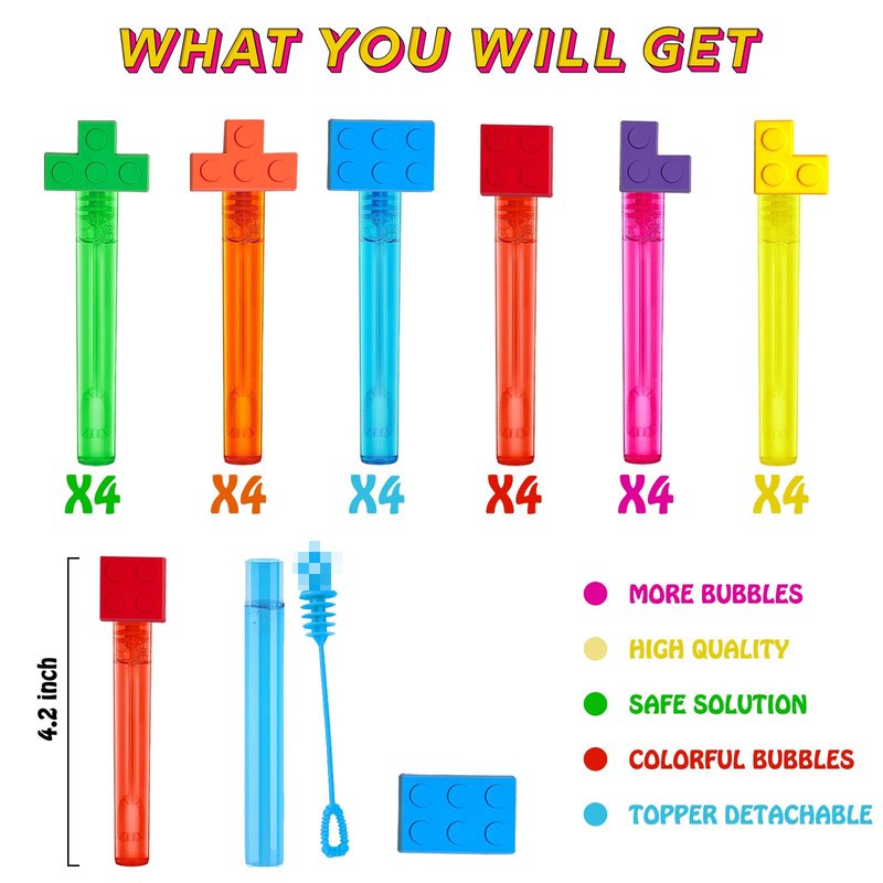 - Colorful And Multi Pattern Design-Building blocks themed mini bubble toy has 6 colored bubble tubes and 6 different building blocks patterns, which is very cute. And our bubble toppers are detachable, you can collect them or use them for other things, which is also a pleasure