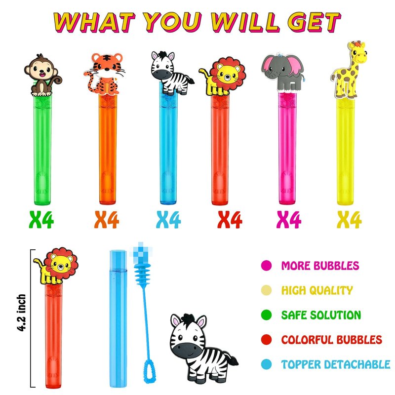 - Jungle Animal Theme Bubble Wand Set Include-Bubble soap liquid set of 24pcs mini bubble wands,6 colors(4 pieces per color).As party supplies reunion fun,make your animal party amazing
