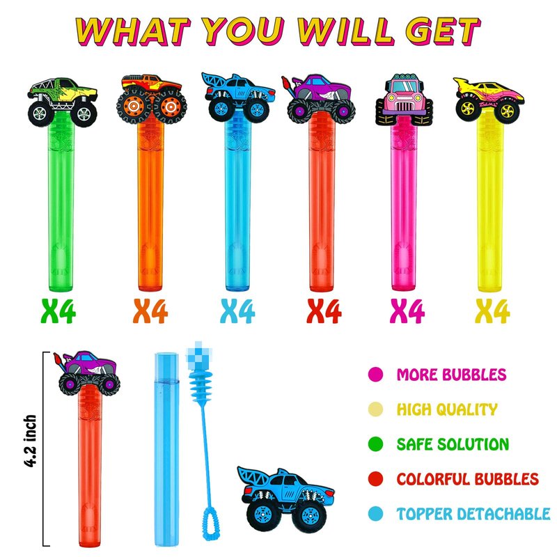 - Monster Truck Theme Bubble Wand Set Include-Bubble soap liquid set of 24pcs mini bubble wands,6 colors(4 pieces per color).As party supplies reunion fun,make your wheel truck party amazing
