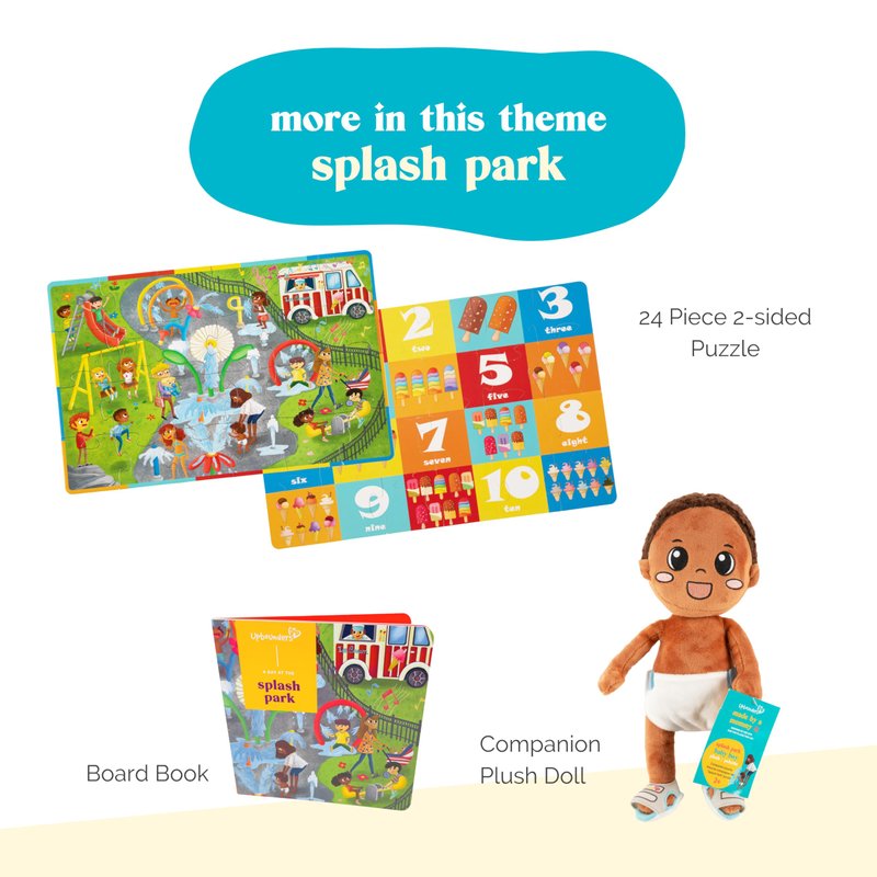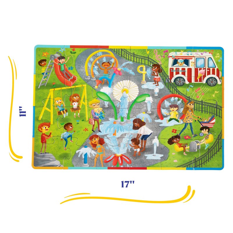 - 2-SIDED KIDS PUZZLE: Vibrant and joyful, the Splash Parks & Ice Cream Cones 2-sided jumbo puzzle reflects everyday scenes of childhood spent swinging, sliding, and splashing at the playground, a familiar multicultural scene for children across the nation.The other side has a 1 through 10 counting activity with ice cream treats.