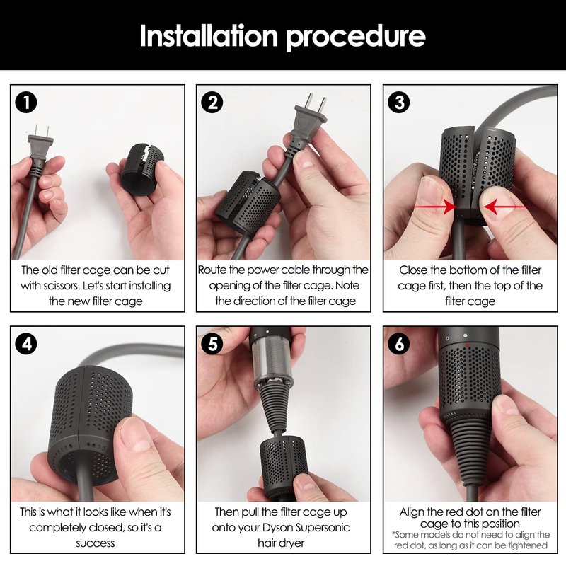 5.First let dustproof outer cover inserted into hair dryer to no gap, can not let dustproof outer cover there is not inserted into the part of the hair dryer, check, and then tighten dustproof outer cover, dustproof outer cover on the red dot near or aligned with the solid white point on the hair dryer(some models do not need to align the red dot. As long as you can tighten it).