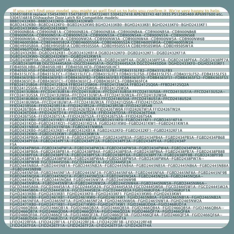 - 💗【Model】 5304516818 Dishwasher door latch kit replace 5304525218 154543901 154758101 154722401 5304527418 AP6783743 4813935 PS12585469 AP6997600 door latch compatible electrolux kenmore frigidaire dishwasher door latch kit: FDB4050LHS0 FDB4315LFS1F DBB4365FS0 FGBD2432KF1 FGHD2433KB1 FGBD2434PW1A FGBD2438PF7A FGBD2445NW7A FGHD2461KB0 FFBD2412SW2A FFCD2413UW3A FFCD2418UW2A FFID2421QS0A LFID2422RF4B FFID2423RS4B LFID2426TF3A FGHD2465NW2A FGID2466QF8A FGIP2468UF1A FGHD2471KW1 58715372100A etc.