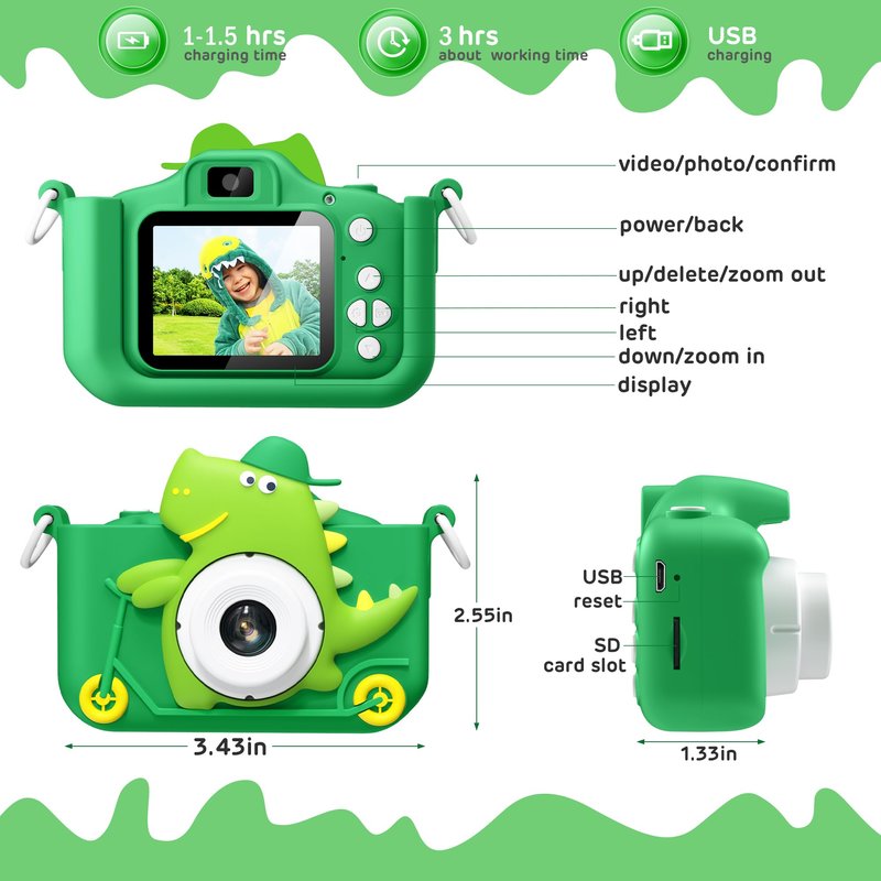 - 【Upgraded Specially Design for Children】Upgraded to dual-camera configuration, Easy to take selfies. Just open the switch key to enjoy the fun of taking photos. The cute dinosaur cartoon soft silicone casing provides the toddler camera with anti-drop design, allows kids to enjoy happy and freedom photography moments without worries of broken. The digital camera for kids also specially designed a durable lanyard for portability, children can hang the camera on their neck, makes this toy easy to use outdoor for 3-12 years old boys girls.