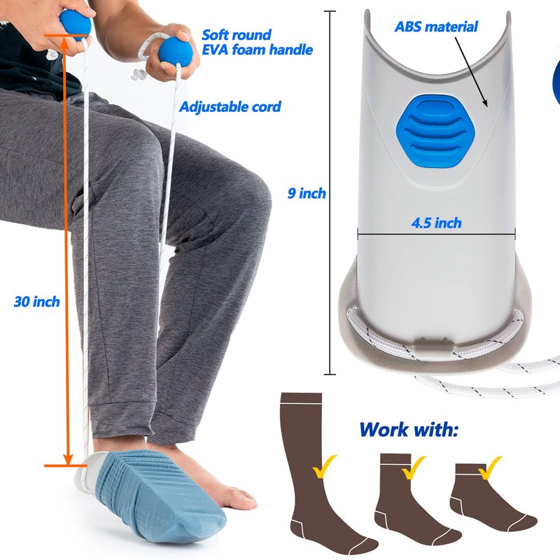 The sock aid device for seniors is made of high quality molded plastic that is durable but flexible enough to work with all sizes of socks from small to extra large for both men and women. It works with all types of socks including athletic socks, dress socks, stockings or casual socks. Perfect for those with limited mobility and those recovering from surgery or injury.