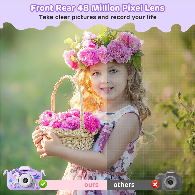 - 【48 Million Pixels and 1080P HD Video 】- This kids digital camera has Front/Rear lens 48 million pixels, 1080P recording video, and 2.0-inch HD IPS eye protection screen, equipped with auto focus and 8x digital zoom, will keep the clear wonderful moment for boys or girls. Greatly improved the photos definition compared with other children cameras on the market.