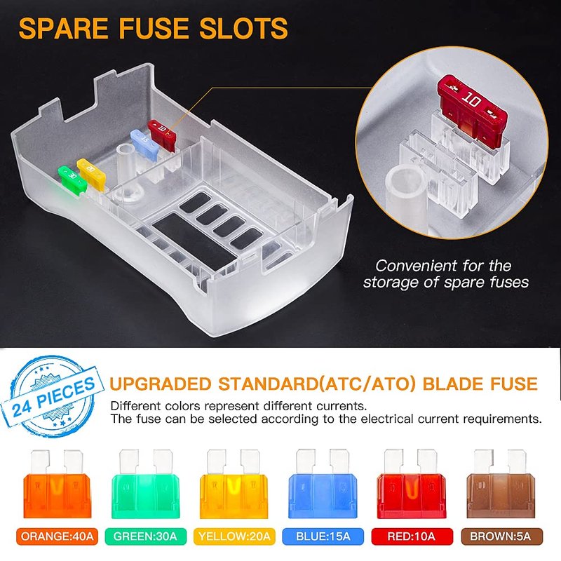 - ★【PROTECTION COVER & SPARE FUSE SLOTS】Transparent plastic cover with screw nut, easy to operate, splash and dust-proof design. Adds extra protection to your fuse box & fuses. Come with multi-function stickers for DIY your specific need, convenient for examination and repair, easy to troubleshoot in outdoor. Spare fuse slots design, convenient for the storage of spare fuses.