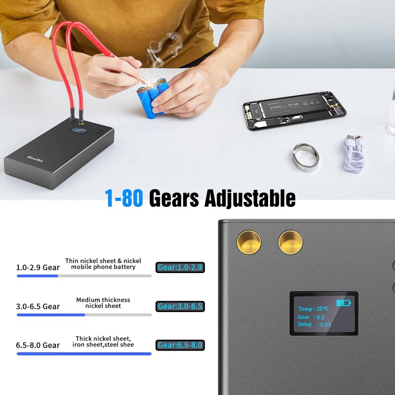 - ★【80 Gears Adjustable】:This mini spot welder equipment with 80 gears output power adjustable,it can be adjusted 1-8 gears and 1.1-5.4-8.0 gears according to your different needs,very fine adjustments can make the welding more precise and the spot welding effect more perfect.
