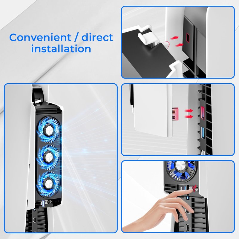 ps5 cooling fan for ps5 Accessories Upgrade your PlayStation 5 gaming experience with the BRHE Quiet Cooler Fan with LED Light and USB3.0 Hubs. Designed to provide optimal cooling and improve performance, this accessory is a must-have for serious gamers. Featuring powerful cooling performance, this quiet cooler fan effectively dissipates heat and prevents your console from overheating during extended gaming sessions. Say goodbye to loud fan noises with the advanced technology that keeps noise levels to a minimum, allowing you to immerse yourself in the game without distractions. Not only does this cooler fan enhance the performance of your PlayStation 5, but it also adds a touch of style to your gaming setup. The built-in LED light creates a cool and vibrant atmosphere, elevating your gaming experience to new levels. In addition, the integrated USB3.0 hubs provide convenient connectivity options for your gaming accessories. Connect your controllers, headsets, or external hard drives effortlessly and enjoy fast data transfer speeds. Installation is a breeze with the BRHE Quiet Cooler Fan. Simply attach it to your PlayStation 5 and start enjoying its benefits right away. With its sleek design and durable construction, this accessory seamlessly integrates into your gaming setup. Upgrade your gaming setup and keep your PlayStation 5 cool and quiet with the BRHE Quiet Cooler Fan with LED Light and USB3.0 Hubs. Experience enhanced performance, stylish aesthetics, and convenient connectivity all in one. Take your gaming to the next level with this must-have accessory.