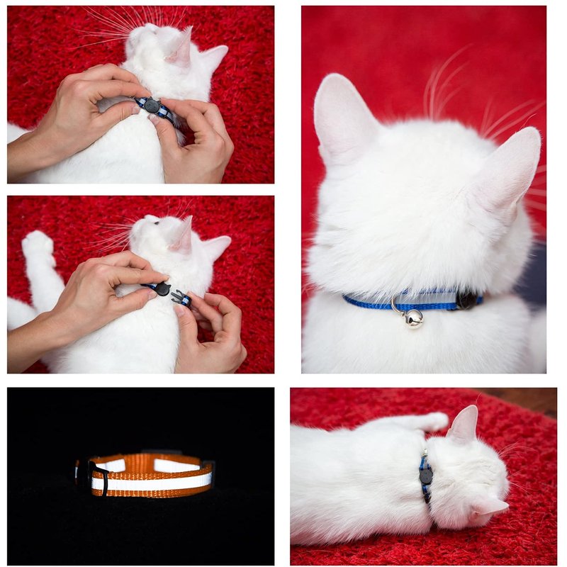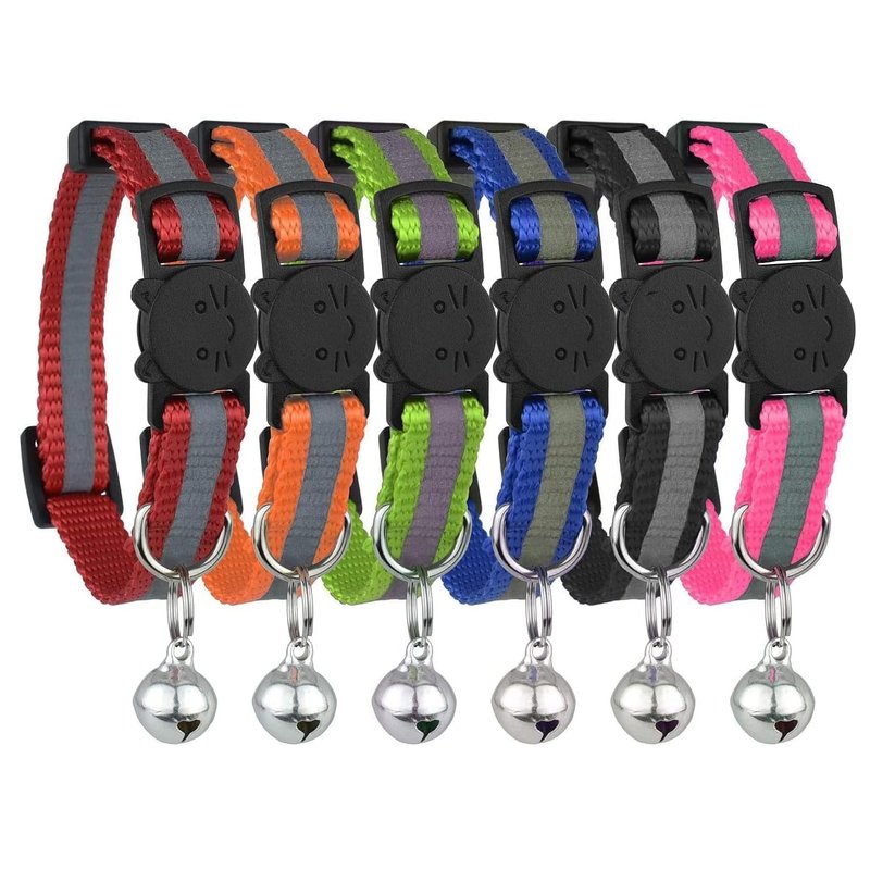 NEW & IMPROVED 6-PACK - Our cat collar set contains 6 high quality cat collars of different colors (red, blue, orange, green, purple, pink) HIGH QUALITY KITTY COLLARS - Our reflective cat / dog collar is solid, made of nylon. Comes with bells. WORKS ON MANY PETS - Great collars for cats and small dogs and other small pets as well. ADJUSTABLE SIZE - The size of the Breakaway Cat Collars is 7-11" (adjustable range)