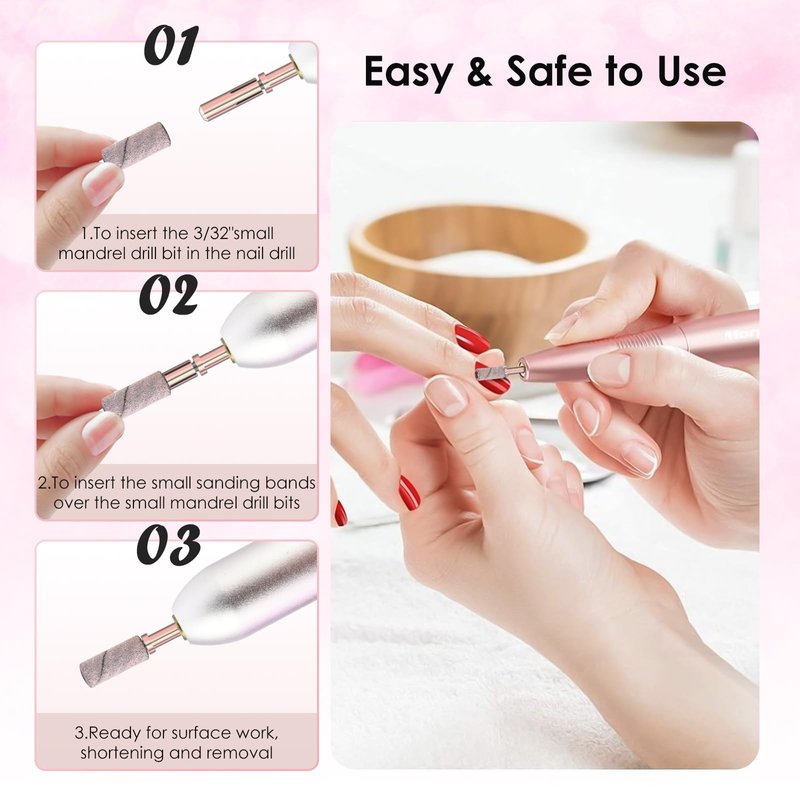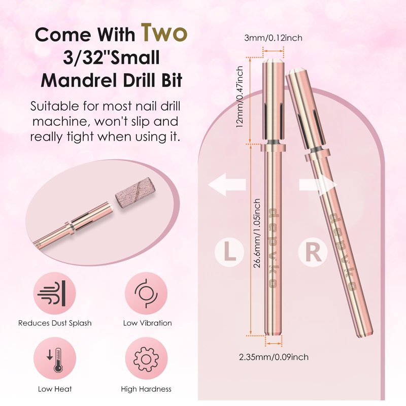 - 【3.1MM Mandrel Drill Bit for Easy Use】Equiped with 2pcs small mandrel nail bits, which are suitable for most 3/32" nail drill machines, and used for grinding, smoothening, shaping, shortening, and polishing for all nail arts as well as cuticle removal. Just select a small sanding band on the small mandrel drill bits, and apply gentle pressure to the surface of the bed.