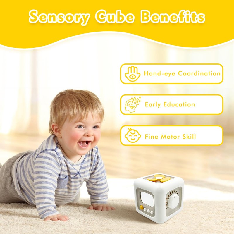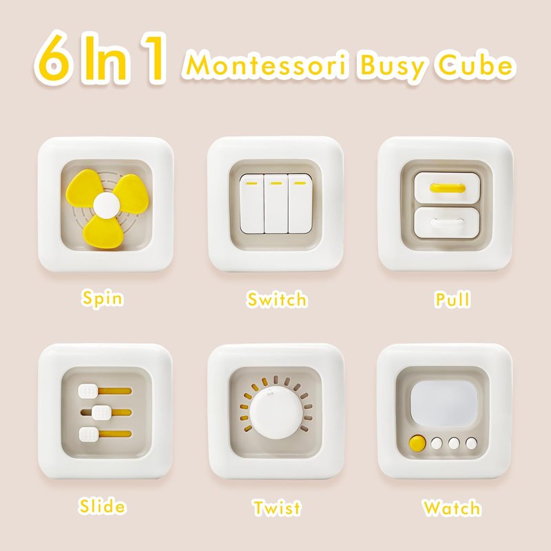 - 【6-in-1 Cognitive Toy】This montessori busy cube features six learning activities. Engage your toddler with this interactive activity cube, designed to promote sensory exploration and fine motor skills development.