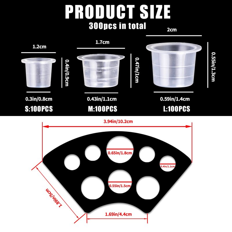 - 【NEW COMBINATION】: Ink cup set consists of 300 ink cups and 2 Ink Holders, #11 small 100pcs, #14 medium 100pcs, #17 large 100pcs, 2 black tattoo ink holders.