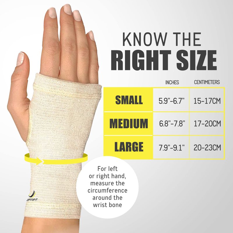 Choose the size that exactly fits the circumference around your wrist bone. Our sizes are based on average compression pressure, so if a tighter fit is desired, choose one size smaller. Refer to this table below: