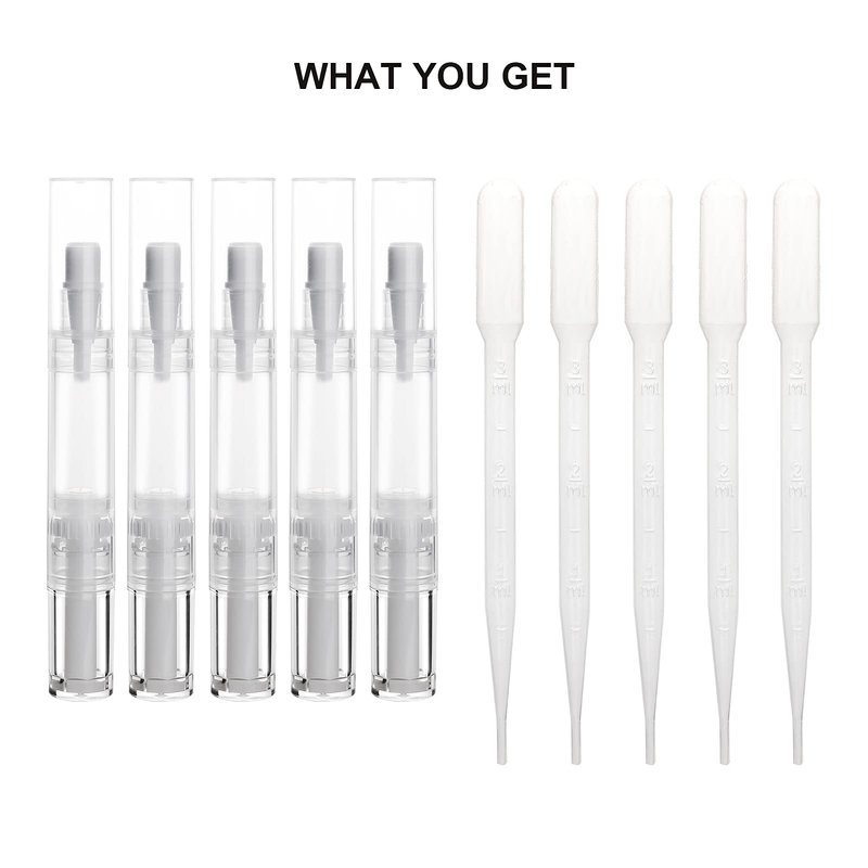 UPZIGS 5 pack 5ml Transparent Twist Pen for Cuticle Oil Applicator, Empty Nail Oil Pen with Brush Tip, Eyelash Growth Liquid Tube, Cosmetic Lip Gloss Container (5x)