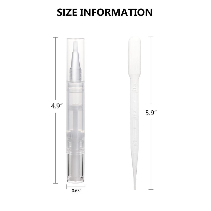 - 【LEAK-PROOF DESIGN】 The empty cuticle oil pens are made of quality PP Plastic, Lightweight(0.45ounce) and portable size (0.63” x 4.9''). Brush top is leak-proof, easy to carry in pocket or bags, perfect for on the go.