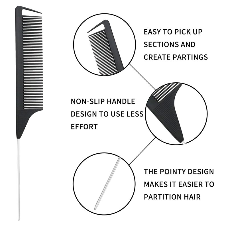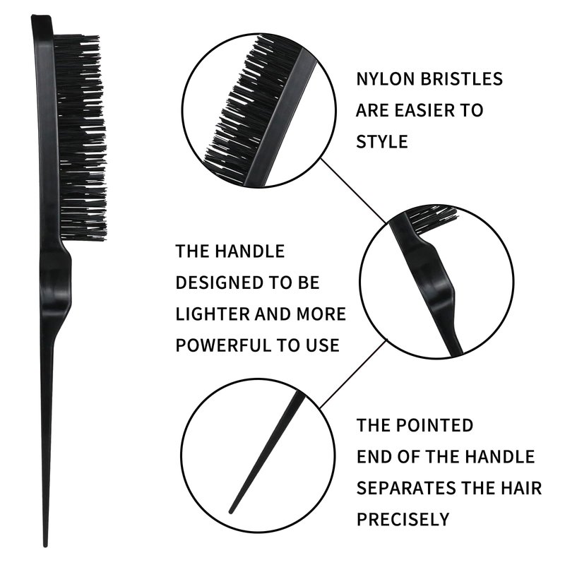 - 🌷【Rat Tail Comb & Doubl sided edge brush】: This rat tail comb is made of 304 stainless steel needles and environmentally friendly ABS plastic teasing comb, which will not break during normal use. Heat resistant, for hair styling, parting, styling after styling, weaving wigs, hair coloring, styling and hair cutting. Double-sided side brush is made of environmentally friendly ABS plastic suitable for combing bangs, hairline, hair edges, eyebrows and eyelashes, back hair, and distribution.