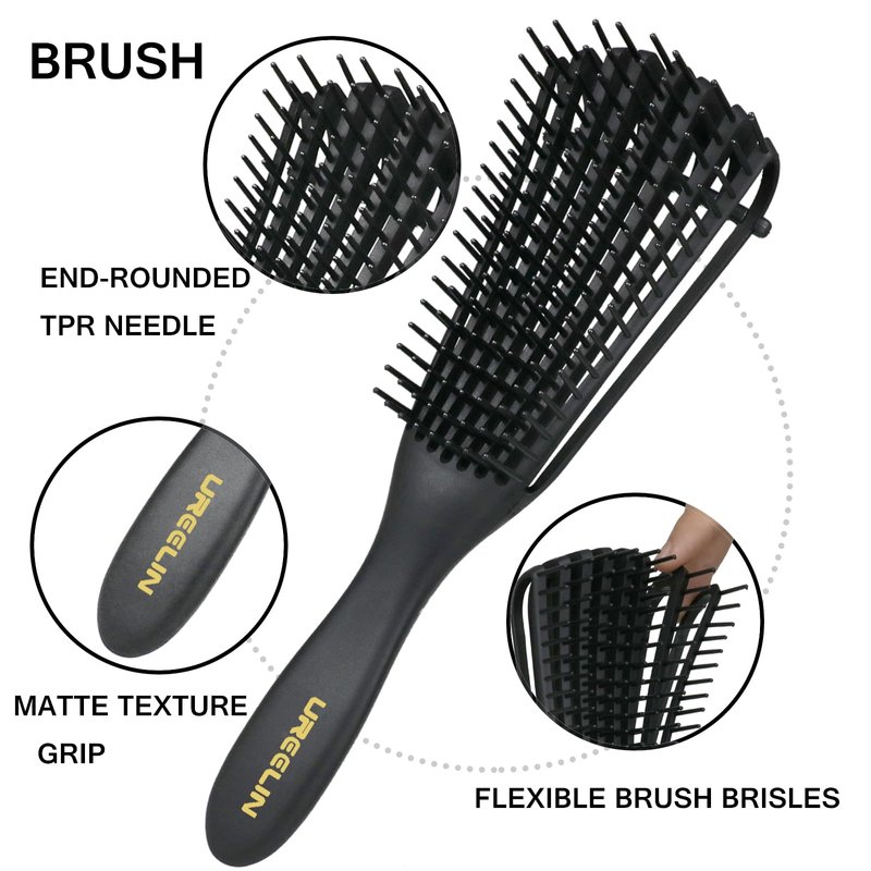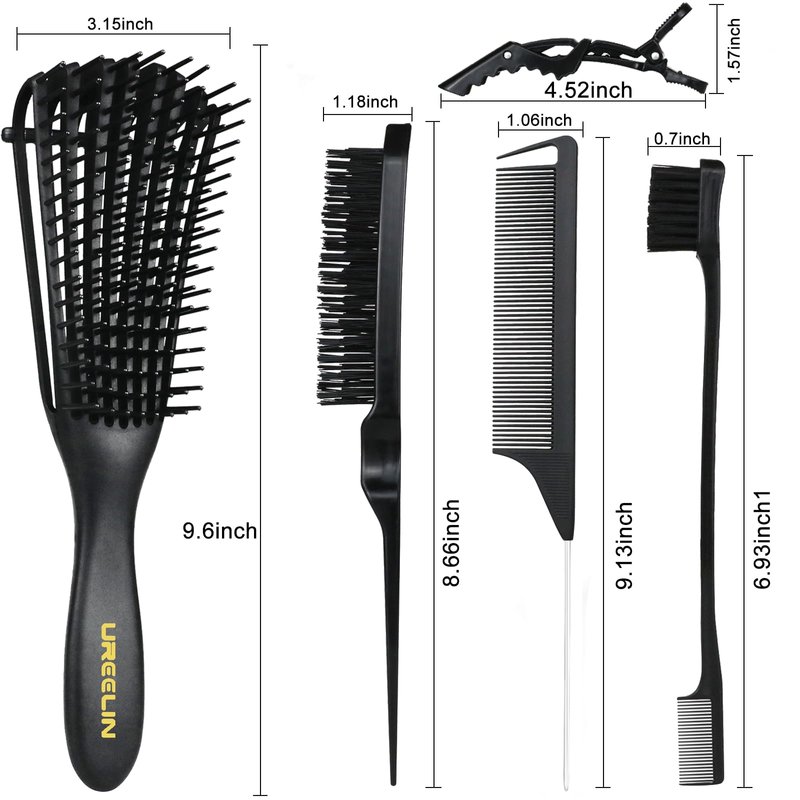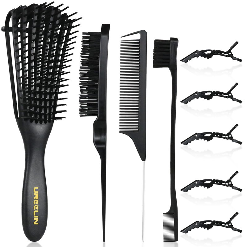 UREELIN Detangling Brush set,Detangler Hair Brush with Teasing & Edge Brush for Curly Hiar, Rat Tail Comb Alligator Hair Clips for 3a to 4c Kinky Wavy/Curly/Coily/Wet/Dry/Oil/Thick/Long Hair(Black)
