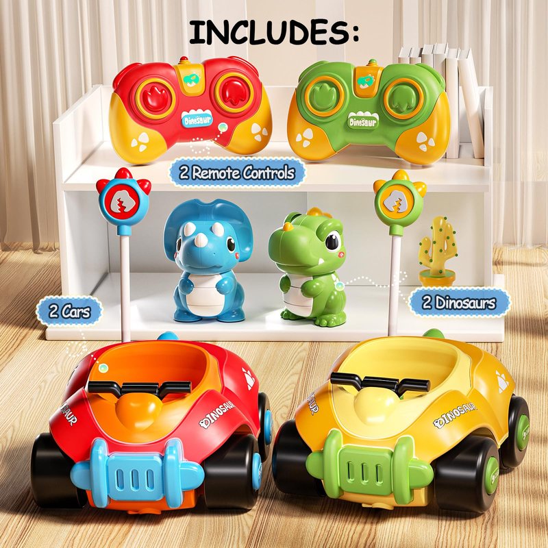 - 【Detachable Dinosaurs】You will receive 2 remote controllers, 2 remote control cars and 2 dinosaurs, your child can put the dinosaur in the driving seat or play alone to get more imaginative stimulation during the game. The remote control requires 2 AA batteries, and the remote control car requires 3 AA batteries (not included).