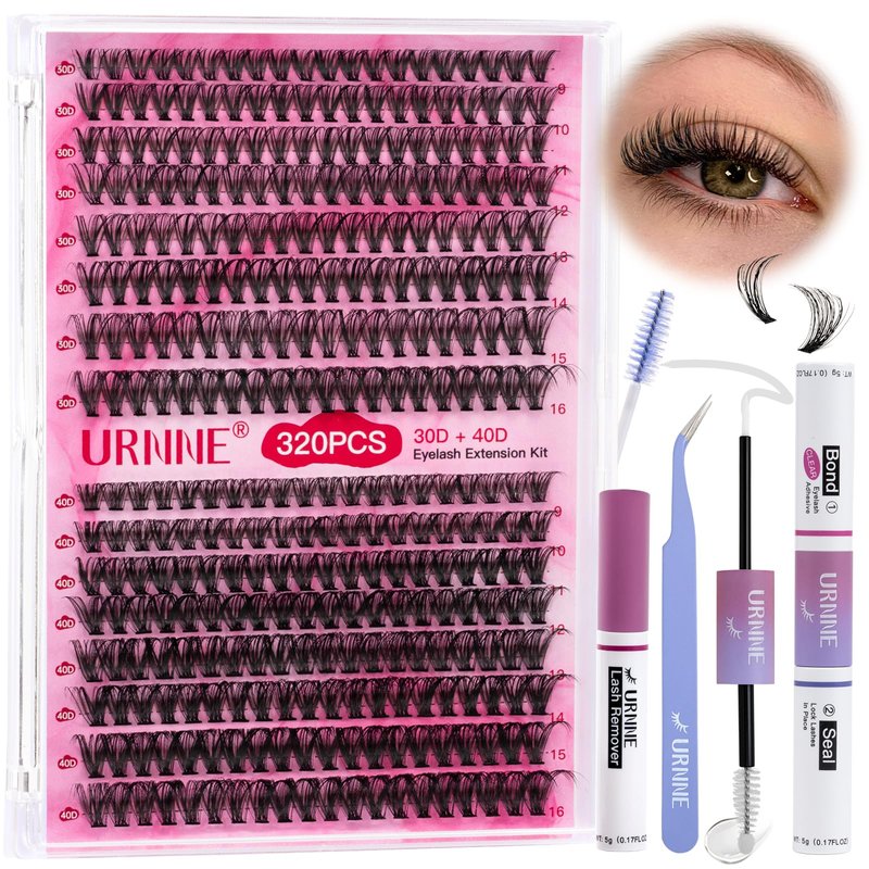 URNNE DIY Lash Extension Kit, 9-16mm Mix 30D 40D Eyelash Extensions Kit, 320pcs Individual Eyelash Clusters, Lash Clusters Kit with Bond and Seal, Remover, Tweezers
